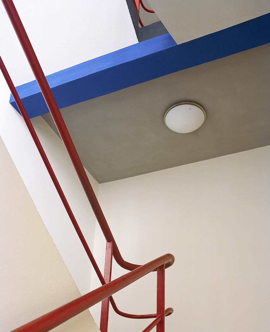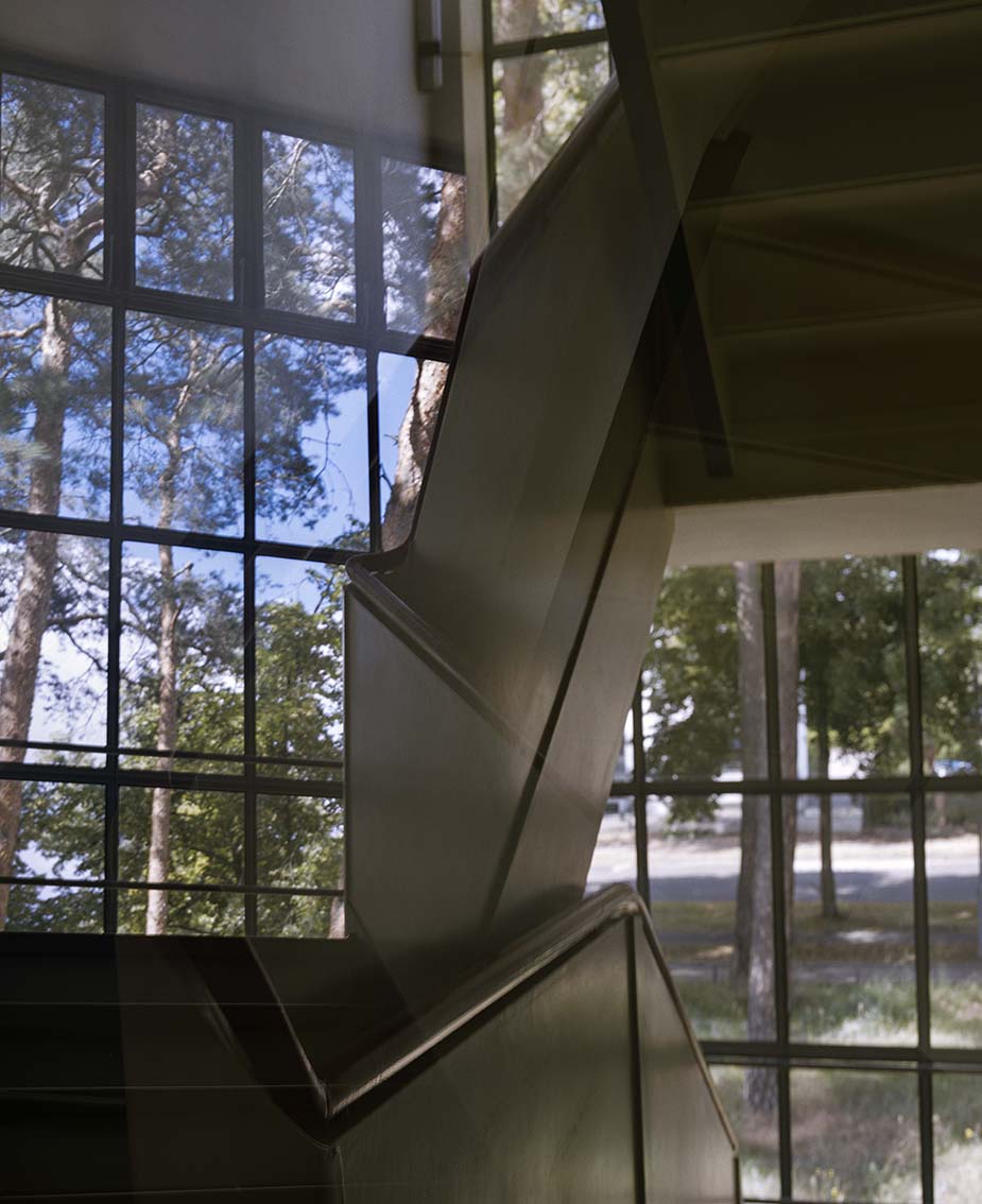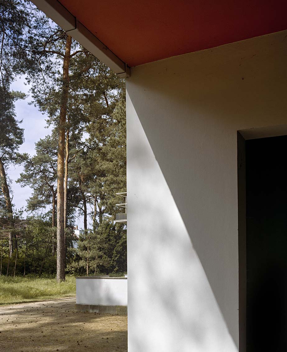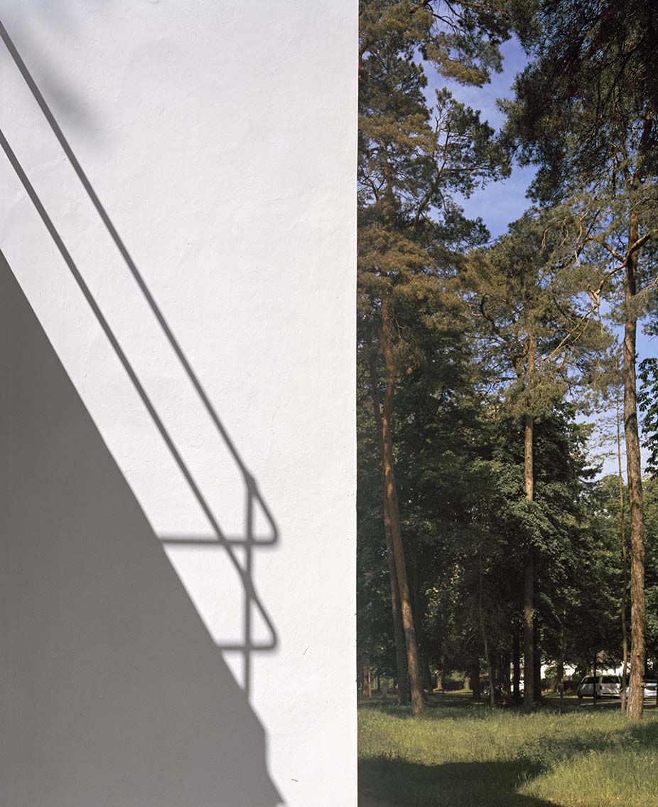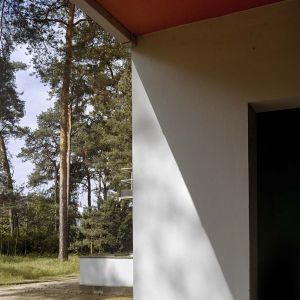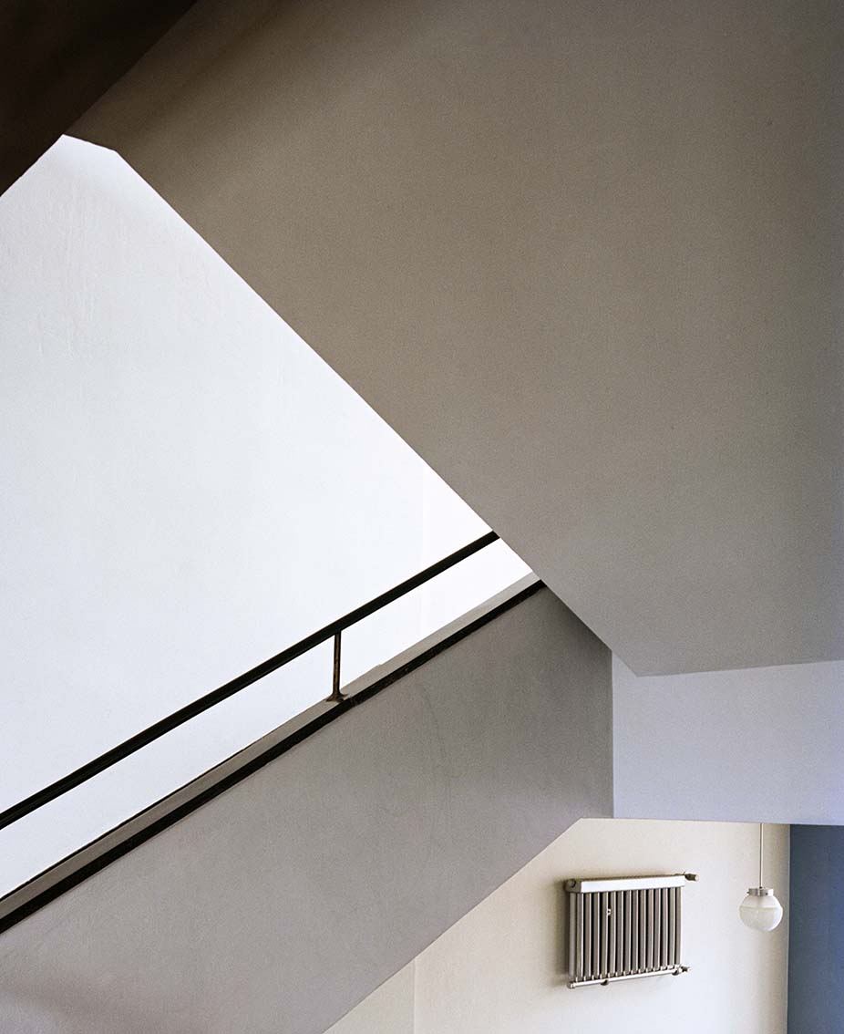Margret Hoppe was a resident artist at the Bauhaus Dessau Foundation in 2024. The conceptual starting point of her photographic work was the examination of duplications. In addition to the Muche | Schlemmer House – where the artists in residence live and work – two reference images of the Masters’ Houses form the framework: a photograph by Lucia Moholy and a two-part image by photographer Benjamin Subtil. In correspondence with the Masters’ Houses, in each of which one half of the building is rotated 90 degrees, Hoppe has also rotated the back of the camera 90 degrees, creating double exposures. In her twelve-part series, Hoppe forms pairs. This happens through the double exposure in the pictures themselves or through similarities and neighbourhoods between the shots. At the same time, these pairs are repeatedly uncoupled by single images (unpair).